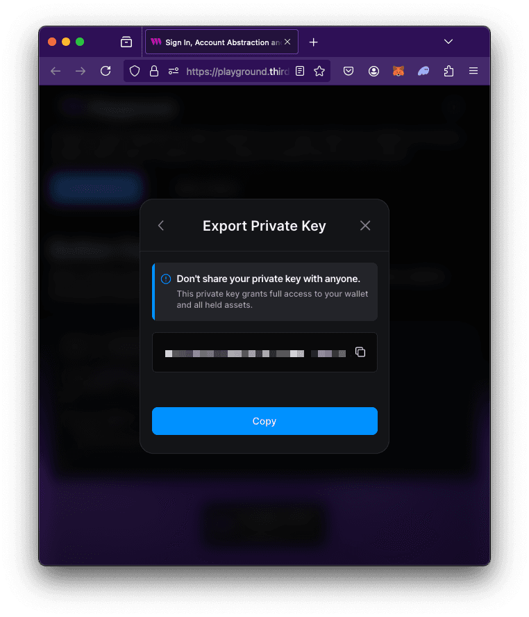 As an advanced option, to hide the export private key option from the modal, set the hidePrivateKeyOption